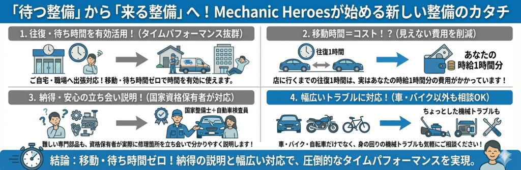 ご自宅・職場へ出張対応、タイムパフォーマンス抜群の整備サービス